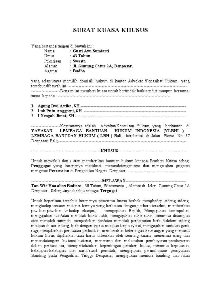 Contoh surat kuasa khusus tidak menutup kemungkinan jika dalam waktu waktu tertentu kita pernah mengalami berbagai macam peristiwa yang terkait dengan pembelaan perkara. Contoh surat kuasa khusus perkara perdata perbuatan melawan hukum pmh surat kuasa. Yang bertandatangan/cap jempol di bawah ini berkenaan dengan pemberian kuasa di atas, penerima kuasa berhak dan berwenang untuk melakukan teguran, menjawab teguran, melakukan pelaporan, mengajukan/ menangani gugatan, menghadiri serta berbicara baik di dalam. Dalam hal pelimpahan wewenang dimaksud, maka pemberi wewenang harus memberikan surat kuasa. Pemberi kuasa untuk membela sebagai.