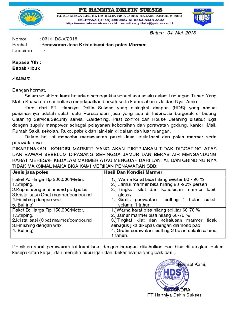 Hal ini memperlihatkan bahwa sebuah perusahaan atau seseorang itu mampu atau bisa membuat sesuatu yang tidak ada pada orang lain, baik itu produk atau pun jasa yang dikuasai. Surat penawaran termasuk salah satu contoh surat resmi. Demikianlah surat penawaran jasa katering ini kami sampaikan, besar harapan kami untuk bisa bekerja sama dengan perusahaan wedding organizer yang bapak pimpin. Tidak berbeda dengan penjualan produk, penjualan jasa tetap memerlukan trik marketing yang tepat sasaran. Bagi kalian yang belum tahu atau.