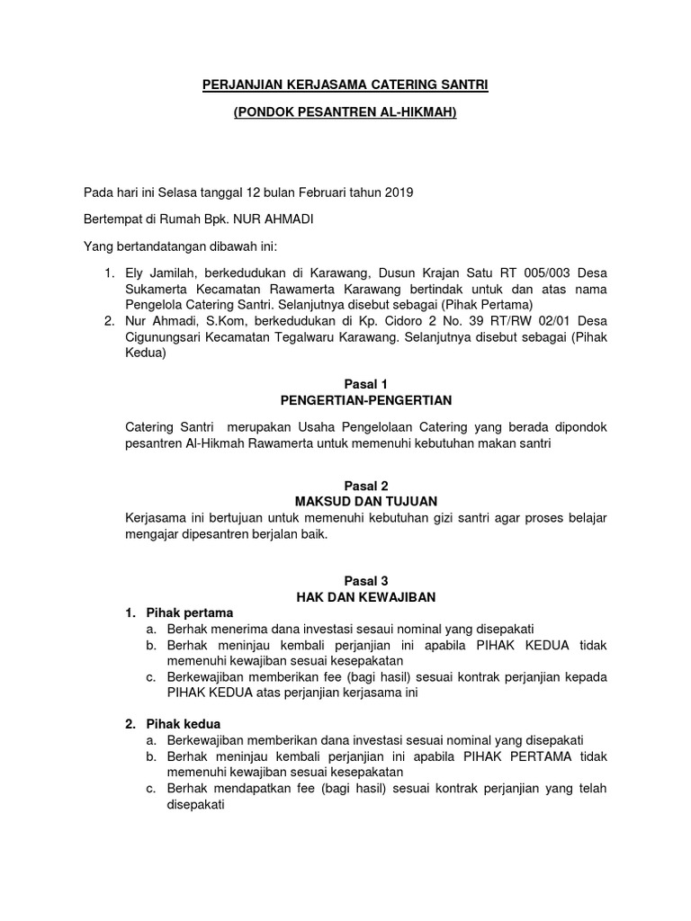 Contoh Surat Perjanjian Kerjasama Catering Dengan Perusahaan - Contoh Surat Perjanjian Kerjasama Catering Surat 26 Cute766 : Contoh surat perjanjian kerjasama bagi hasil di atas menggunakan format yang singkat dan benar.. Contoh surat perjanjian adalah surat yang mengatur tentang hak dan kewajiban dua orang yang melakukan sebuah kesepakatan atas suatu perkara dan biasanya surat perjanjian ini ditulis untuk menangani kegiatan penting terutama masalah harta ataupun uang dengan jumlah yang tidak sedikit. Contoh surat perjanjian kerjasama usaha yang baik harus memenuhi sejumlah syarat tertentu. Misal kontrak dalam membangun sebuah perusahaan. Surat perjanjian memiliki sifat mengikat semua pihak yang terlibat di dalamnya. Contoh surat perjanjian catering detiklife.