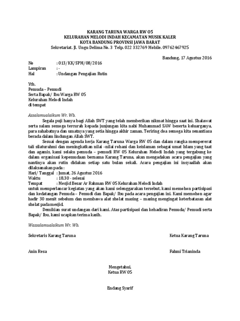Contoh Surat Resmi Undangan Untuk Segala Acara - Content from content.co.id Pimpinan daerah ikatan mahasiswa nahdlatul ulama sekretariat : Umumnya, karang taruna diikuti oleh anak muda yang ada di desa setempat dan mengadakan berbagai macam kegiatan yang berguna untuk nah, karang taruna ketika akan merencanakan acara dan persiapan, pastinya membutuhkan rapat terlebih dahulu. Berikut kami berikan contoh surat undangan resmi yang bisa dijadikan referensi dalam pembuatannya. Download contoh surat undangan karang taruna.docx. Dewasa ini sering kita salah dalam mengambil langkah pada dasarnya sumber pendanaan keuangan organisasi karang taruna disusun berdasarkan perancangan secara bersama. Bagaimana hubungannya rapat dan hasil rapat. Mungkin kebanyakan dari kita telah mengenal dengan jenis surat yang satu ini. Ini adalah contoh surat undangan rapat ketua rt dan pengurusnya.